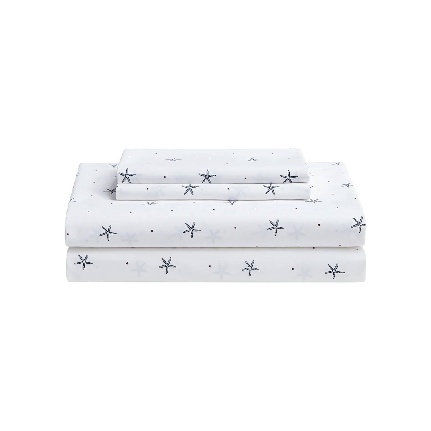 Queen size Coastal Beach Starfish White Navy Red 100-Percent Cotton Sheet Set