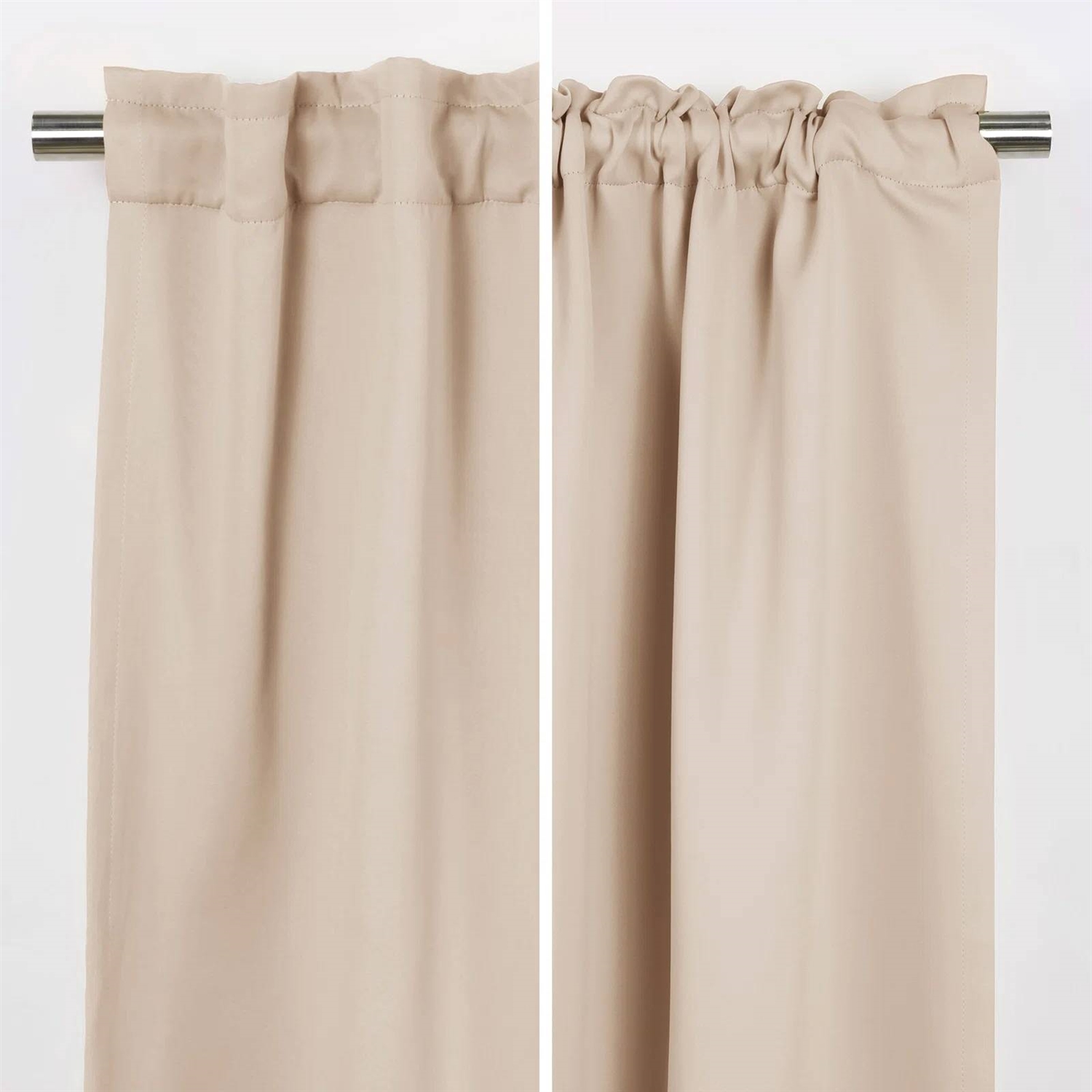 Frame your French doors to the patio with these 52 x 126 inch Solid Beige Cream Thermal Blackout Curtain Panels - Set of 2, showcasing a solid hue and rod pocket design. The blackout design is perfect for keeping the sun at bay, so you can enjoy sleeping in on Sunday mornings or catching a mid-day nap in the den. Note: Actual product color may vary from the images shown on-site. Every monitor or mobile display has a different capability to display colors, and every individual may see these colors differently. The darker colors are more effective in blocking out light and the lighter colors are less effective. White/Light colors are for room darkening.