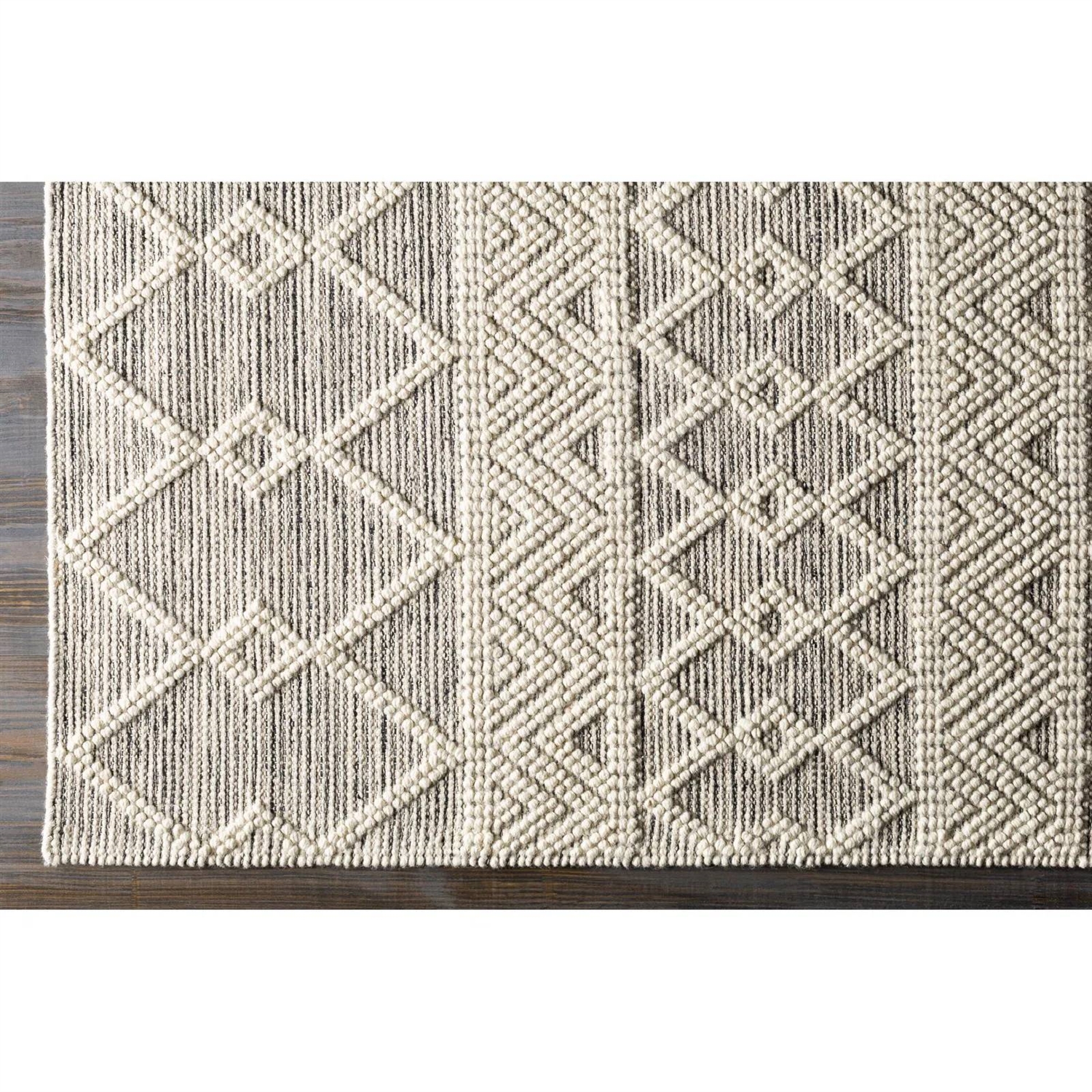 This 3-ft. x 5-ft. Hand Woven Wool Blend Grey Beige Ivory Persian Style Area Rug elevates your living room with a motif inspired by classic Persian textile arts and lodge-inspired style. It's handmade in India from 65% wool, and 35% polyester – a material that's naturally durable, hypoallergenic, and stain-resistant. The design features a high-low pile height with rows of cream geometric patterns that stand out against the gray background. This makes it a great choice for creating a cozy environment in lower-traffic rooms. We recommend rolling out a rug pad underneath to keep it securely in place.