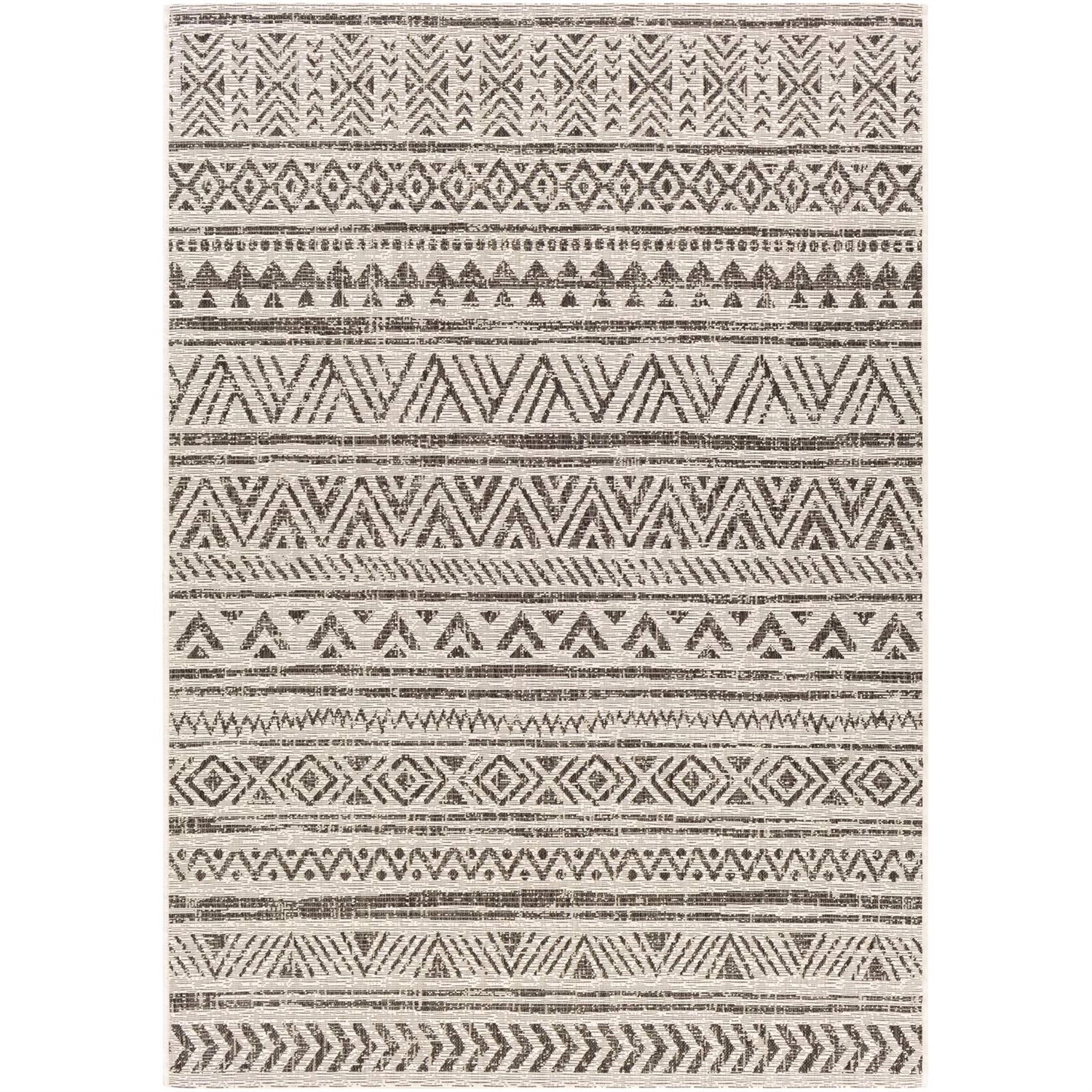 This 5 ft. x 8 ft. Black Off-White Chevron Coastal Boho Style Indoor Outdoor Area Rug grounds your indoor or outdoor space in a Moroccan-inspired print. It features rows of various geometric patterns in black and ivory hues, and it's purposefully distressed for a vintage feel. This rug is power-loomed in Turkey from polypropylene, and it has a low 0.16" pile height ideal for high-traffic areas like your patio, entryway, or living room. Best of all, it's fade- and stain-resistant to stand up to regular use. To care for this rug, vacuum it without a beater bar and spot-clean it as needed.