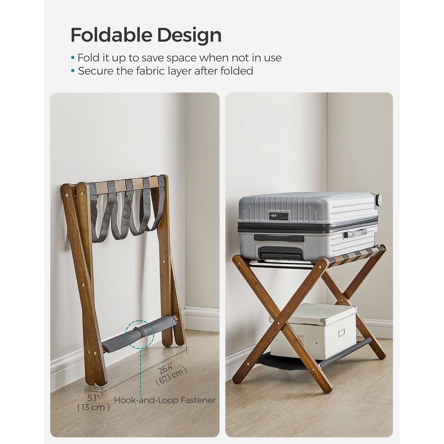 Make your guests feel at home with this Set of 2 - Sturdy Luggage Rack in Walnut Wood Finish with Lower Storage Shelf. It elevates their suitcase to a comfortable height for packing and unpacking, saving you or your guests from bending down to the floor. The natural bamboo frame combined with robust nylon straps supports up to 110 lb on the top and 21 lb on the lower shelf; the espresso finish adds a personal touch to bedrooms, guest rooms, or hotels. This 26.4”D x 18.5”W x 20.1”H (67 x 47 x 51.1 cm) luggage rack, that’s wider than similar ones, can hold 24”, 26”, or 28” suitcases. It folds to a 26.4”D x 3.2”W x 26.6”H (67 x 8.1 x 67.6 cm) size for easy storage in closets or corners. Follow the instructions to connect the 4 corners of the structure with the included Allen key and only one type of screw so you can easily set up this suitcase stand. No more getting lost in nuts and bolts! The lower storage shelf of this luggage rack keeps shoes or other items off the floor; the hook-and-loop fastener on it lets you roll up the fabric layer to keep it neat and clean when folded.