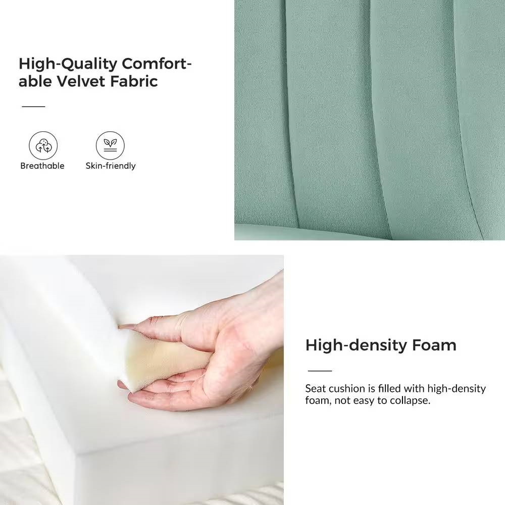 This Sage Green Velvet Upholstered Wingback Accent Side Chair with Gold Metal Legs is the perfect pick for small space. Whether drawn up to your dining table or rounding out your living room with an extra seat, a small side chair like this is a great option wherever you need it. Made with premium velvet fabric, comfortable for skin touch. High-density foam filling with a solid and manufactured wood frame provide comfort and support. The slender polished gold metal legs bring the modern design and add to the timeless fashion of this piece.