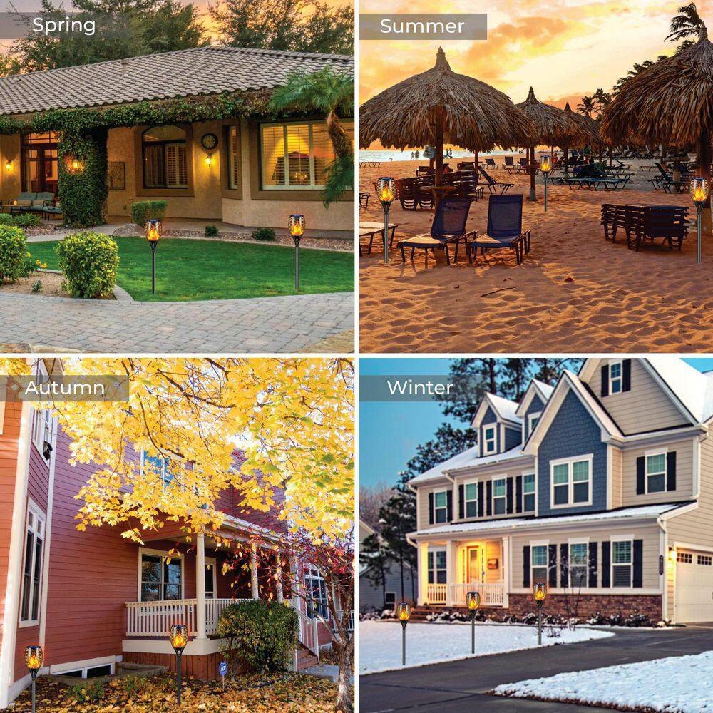 • SOLAR POWERED DECORATIONS: Equipped with high efficiency 96 LED solar panels, Set of 4 - Outdoor Solar Lights LED Tiki Torch Polynesian Style Path Lighting can work up to 10 hrs. during the summer and 8 hrs. during the winter when fully charged. Solar Halloween lights provide vivid décor for outdoor activities and parties during the holiday and more.
