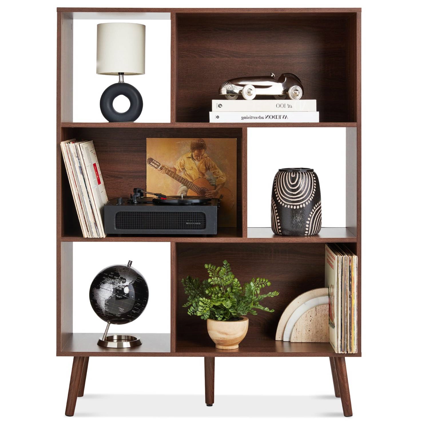 This Mid Century Wood Grain Finished Bookcase Storage Center is crafted with an open design and natural wood-grain finish for subtle texture and a classical mid-century appearance even for modern decor. Come with six 14-inch tall partitions set in 2 distinct sizes to create the ideal space to store or display home decor, from books and vinyl to precious family photos. This bookcase's modern appeal fits throughout your home as the perfect display space in your living room, office, or nursery. Comes with 3 optional back panels let you create the ideal layout, mixing open and enclosed backings if desired. A durable engineered wood frame sits on a set of five solid pine wood legs to reliably support up to 61.6 pounds while maintaining balance at full capacity.