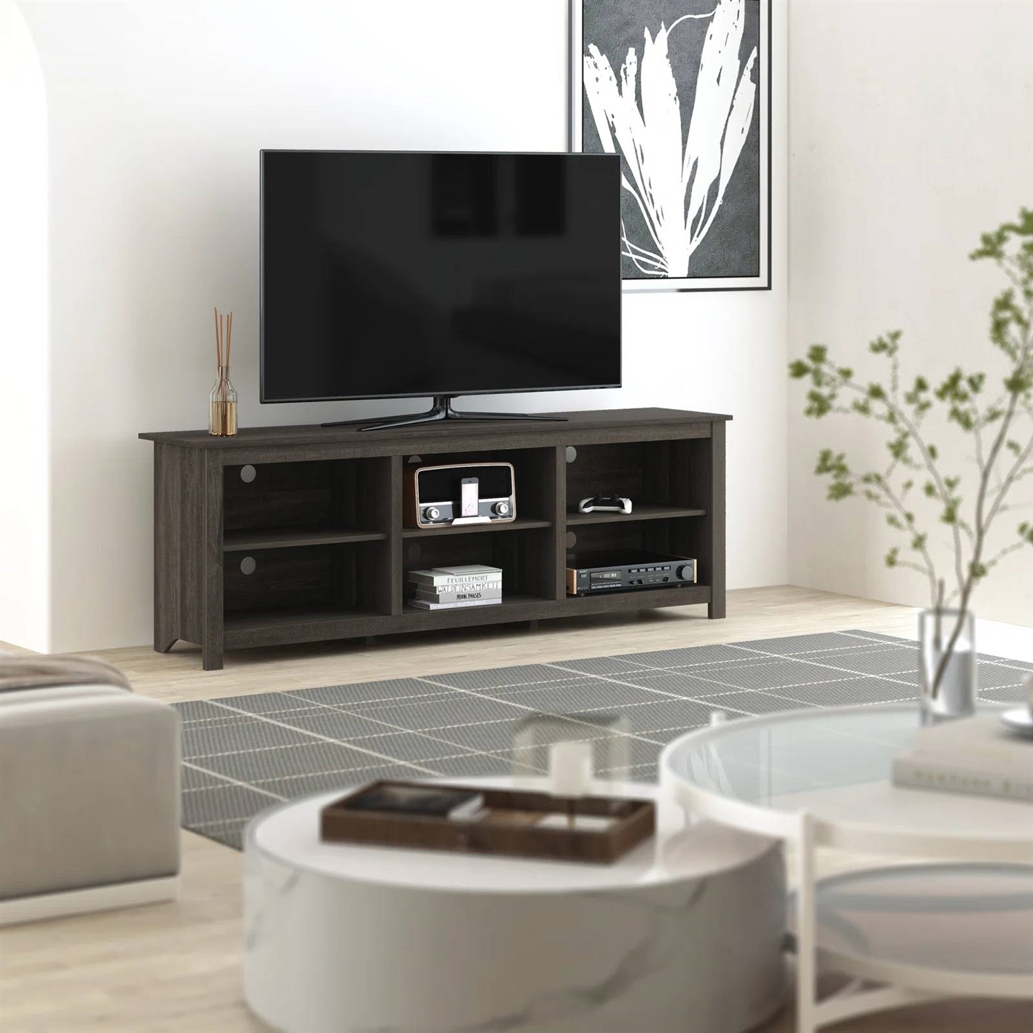 This 70-inch Dark Brown Wood TV Stand Entertainment Center for TV up to 78-inch has more than enough room for up to a 78" TV, making it a welcome addition to any family room or den. It's made from engineered wood and comes in multiple color options, so you can make it your own. This TV stand is full of storage space: Six open compartments that are practically made to display your favorite knick-knacks or romance novels. Best of all, a cable management cutout helps keep pesky wires under control.