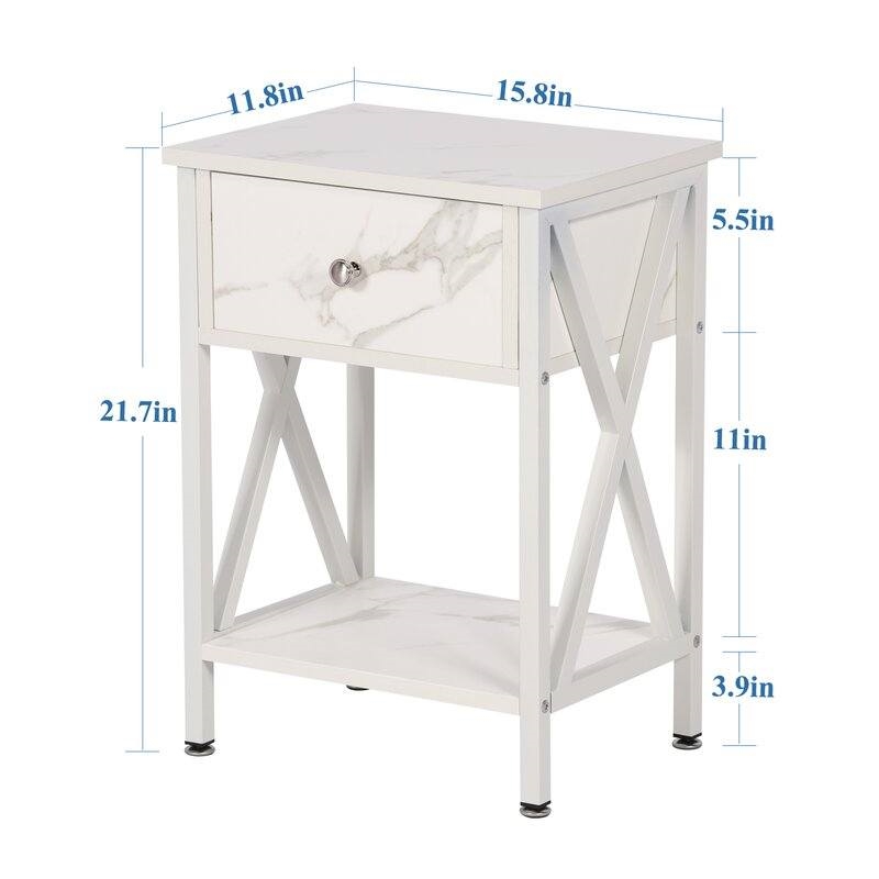 This Rustic 1 Drawer White Nightstand - Set of 2 showcases a mix of materials for a rustic and traditional look in any home. Each bedside table is made from steel and engineered wood and rests on straight legs with sleek X-shaped accents on the side. The single drawer with a black handle opens to reveal room for essentials like reading glasses and personals. An open shelf is ideal for a stack of books and organizational baskets. This nightstand set features 16" broad surfaces that accommodate a table lamp and a few accent pieces. Simple stylish design options are functional and suitable for any room, sturdy on a flat surface, and easy to assemble with parts and tools included.
