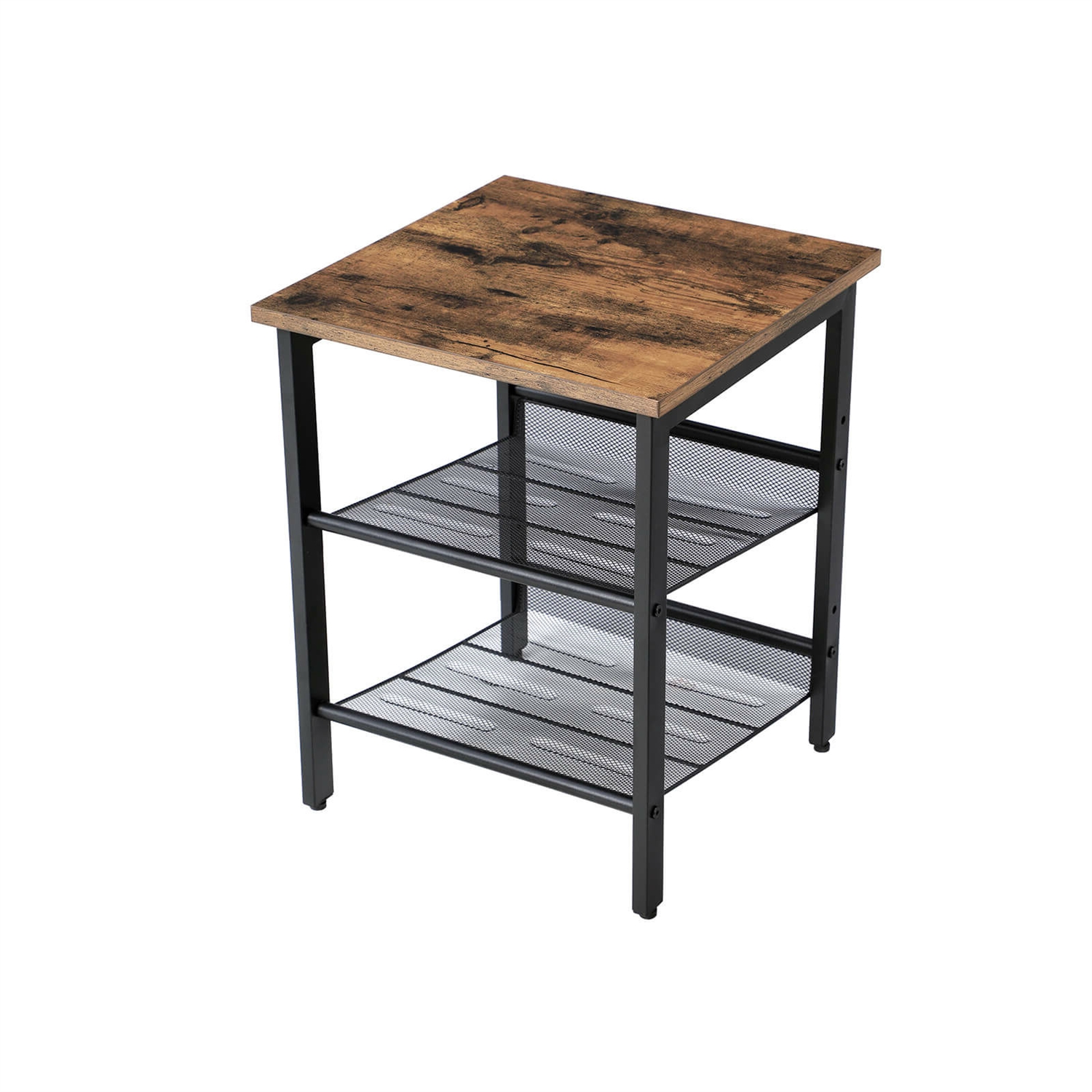 The industrial look of the black iron frame is complemented by the rustic top of the side tables, creating an exciting mix of styles. This Set of 2 Side Table Nightstand with Medium Wood Finish Top and Mesh Shelves fits in the living room next to your sofa or functions as a functional pair of bedside tables. Each end table has two sturdy mesh shelves, both of which you can attach either flat or slightly slanted to properly position magazines, books or a variety of other items on them.