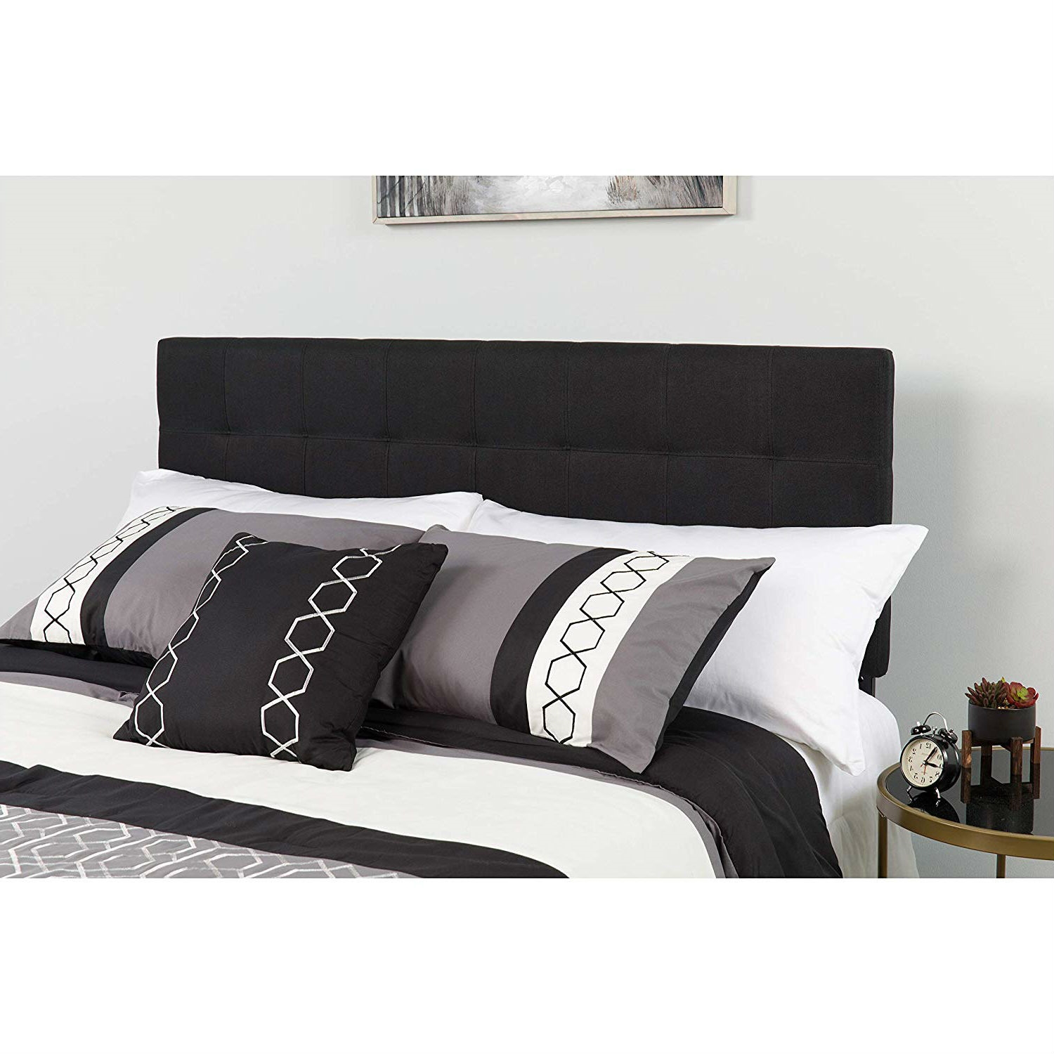 This Queen size Modern Black Fabric Upholstered Panel Headboard will give your room style and complement the size of the room. The slim panel will make your room feel more spacious. The convenience of a headboard will provide you with floor space and makes it easy to make up the bed. Headboard features box stitching with a slight tufted design. Whether you're updating or starting new, this headboard will get your bedroom looking fresh!
