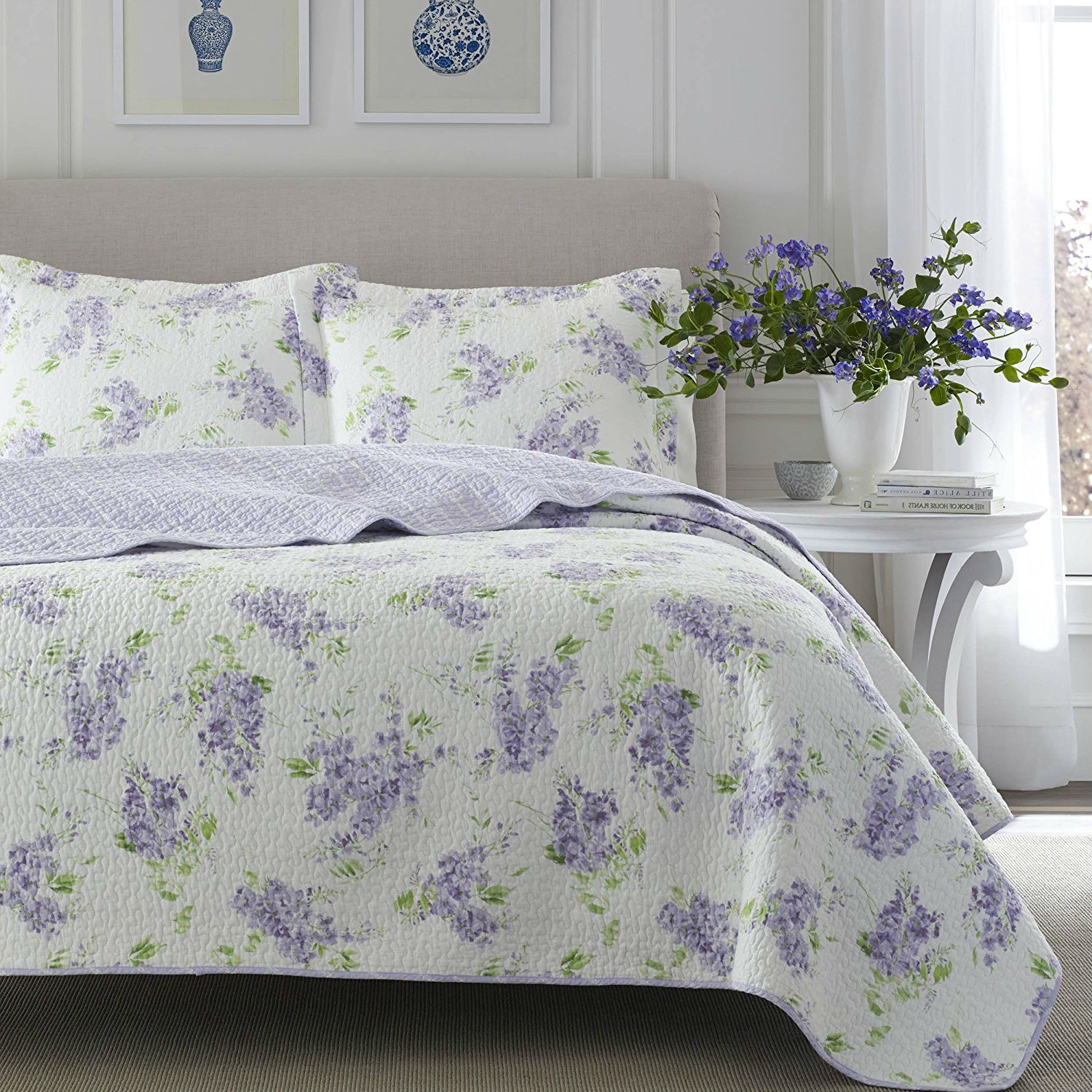Wisteria blossoms cascade across a pristine white background in this Full / Queen size 3-Piece Cotton Quilt Set with White Purple Floral Pattern that will bring a touch of springtime to your bedroom. Pale Lilac tones mix with grass green for a fresh, clean color palette, accented by the white vine stripe print on an Amethyst ground for the quilt reverse. The all cotton quilt is pre-washed for extra softness and the allover vermicelli quilt stitching adds dimension and extra comfort.