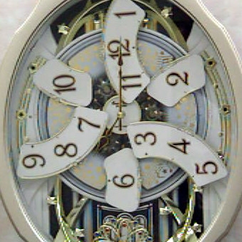 This Moving Face Pendulum Wall Clock - Plays Melodies Every Hour would be a great addition to your home. Every hour on the hour the face breaks into 6 pieces and underneath reveals rotating music notes and little guitars.