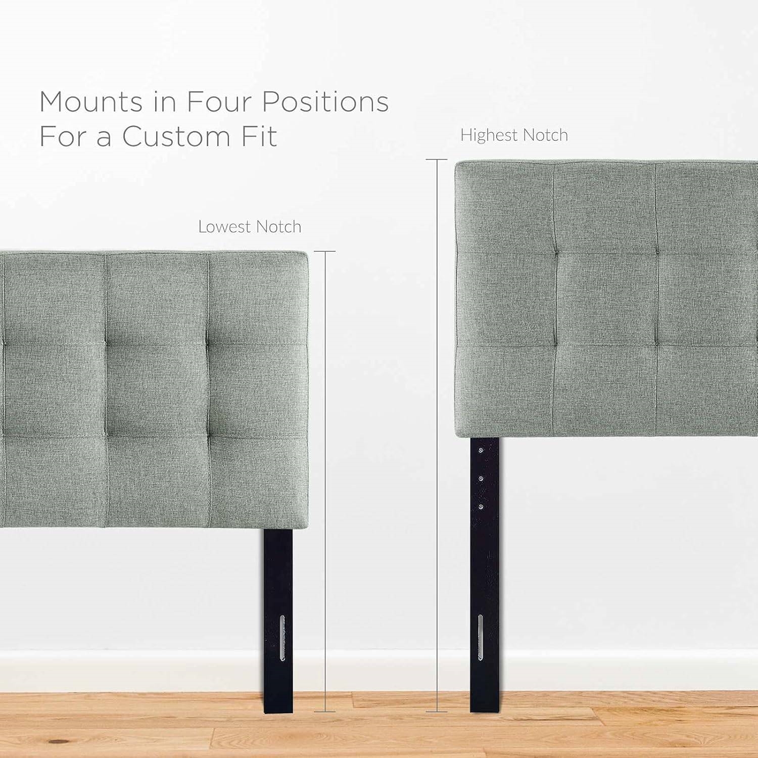 Introduce some boxy pizazz with the lavish design of this King size Grey Fabric Modern Button-Tufted Upholstered Headboard. Intended to be versatile for a wide range of modern bed styles, it's deep button tufting, and carefully aligned trim, present a uniform piece meant to cast prominence upon your room. Fully upholstered in padded fabric, it has a narrow piece meant to convey a strong sense of expansiveness within your entire surroundings. Set Includes: One - Headboard Product Dimensions: Overall Product Dimensions: 3.5"L x 61.5"W x 22.5"H Bedframe Mounting Location: 4.5 - 8.5"H Mounting Location A - Height to Top of Headboard: 52.5"H Mounting Location A - Height to Bottom of Headboard: 30.5"H Mounting Location B - Height to Top of Headboard: 50"H Mounting Location B - Height to Bottom of Headboard: 28"H Mounting Location C - Height to Top of Headboard: 47.5"H Mounting Location C - Height to Bottom of Headboard: 25.5"H Mounting Location D - Height to Top of Headboard: 45"H Mounting Location D - Height to Bottom of Headboard: 23"H Floor to Top of Headboard: 45.5 - 53"H Floor to Bottom of Headboard: 23 - 30.5"H.