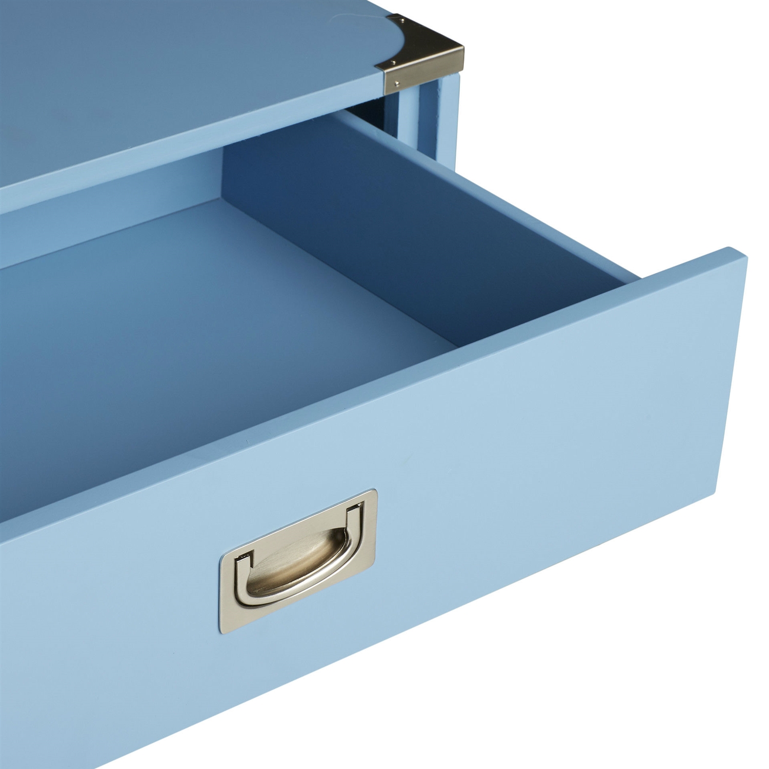 • Bright nickel finish on drawer pull and corner hardware